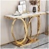 The Aurelio 3-Piece Console Set blends sculptural design with luxurious materials, creating a commanding yet elegant presence in any interior. The centerpiece features a rectangular marble top supported by three interlocking oval rings in gold-finished steel, balanced on a solid steel base for strength and visual harmony. Complementing it are two matching round side consoles, each crowned with a smooth marble surface and elevated by a basket-patterned steel stand that mirrors the gold tones of the main piece. Together, the trio embodies refined craftsmanship, offering a seamless fusion of marble and metal that radiates warmth, sophistication, and timeless contemporary appeal.