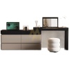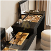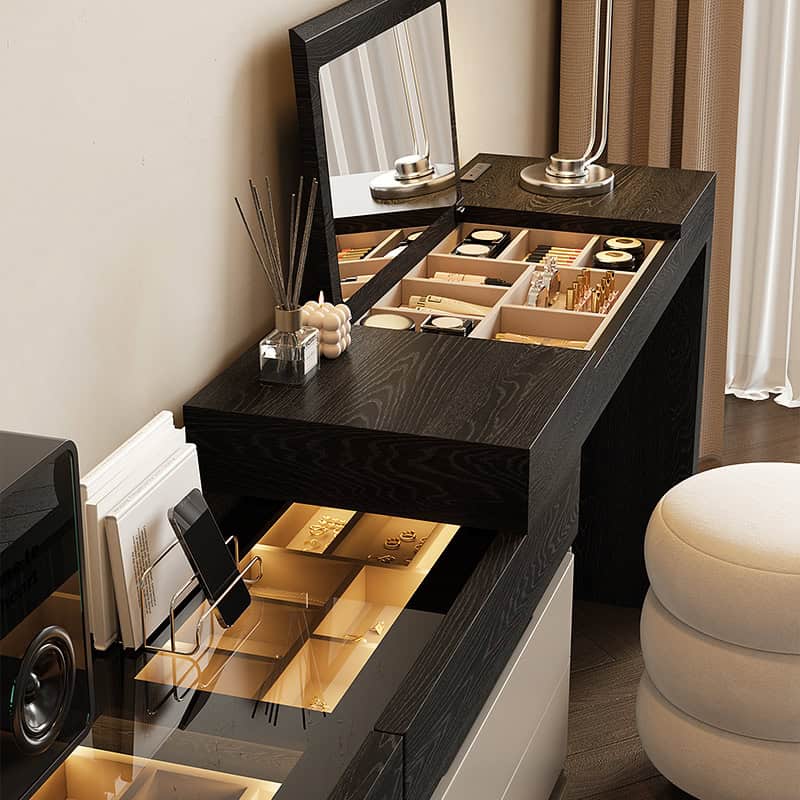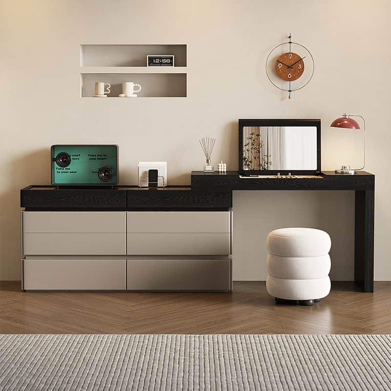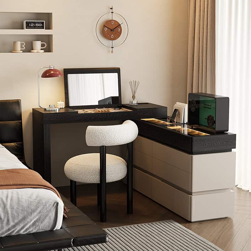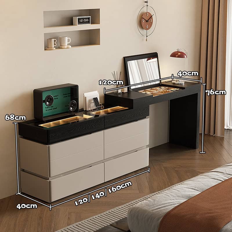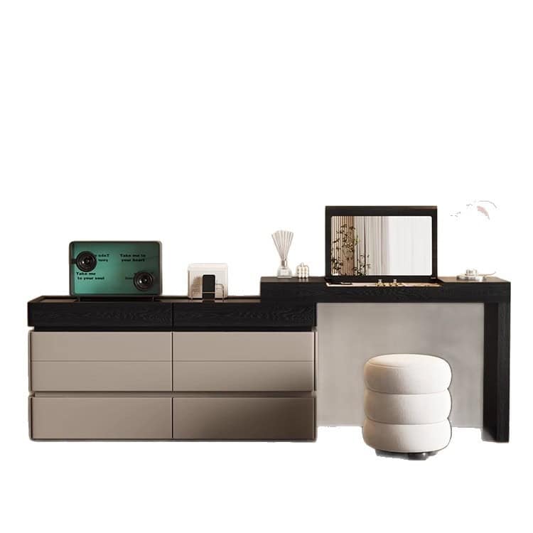 The Aurora Luxe Smart Dresser is a modern high-end vanity console designed for elegance, functionality, and smart organization. Crafted from premium wood with a sleek mirror finish, this sophisticated piece blends warm beige tones with bold black accents for a contemporary aesthetic.