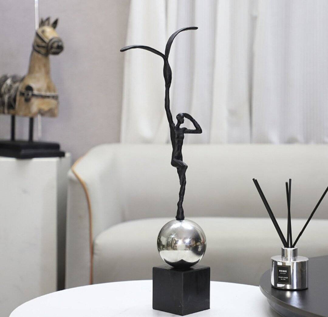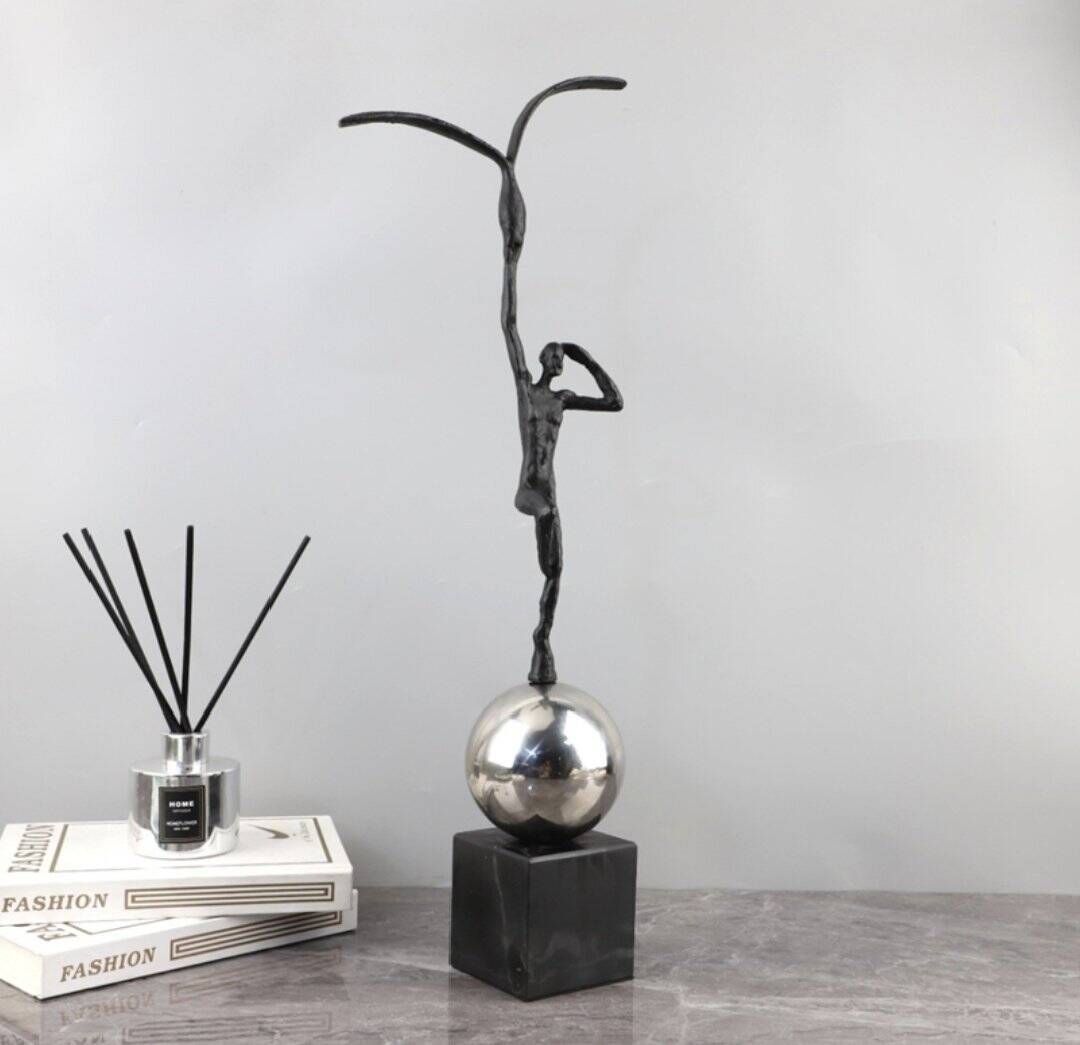 A true masterpiece of modern art, this Elevated Balance Sculpture symbolizes strength, perseverance, and elegance. Crafted with zinc alloy, a polished stainless steel sphere, and a solid marble base, this stunning piece is perfect for home or office décor. Its unique abstract design adds a sense of motion and sophistication to any space.