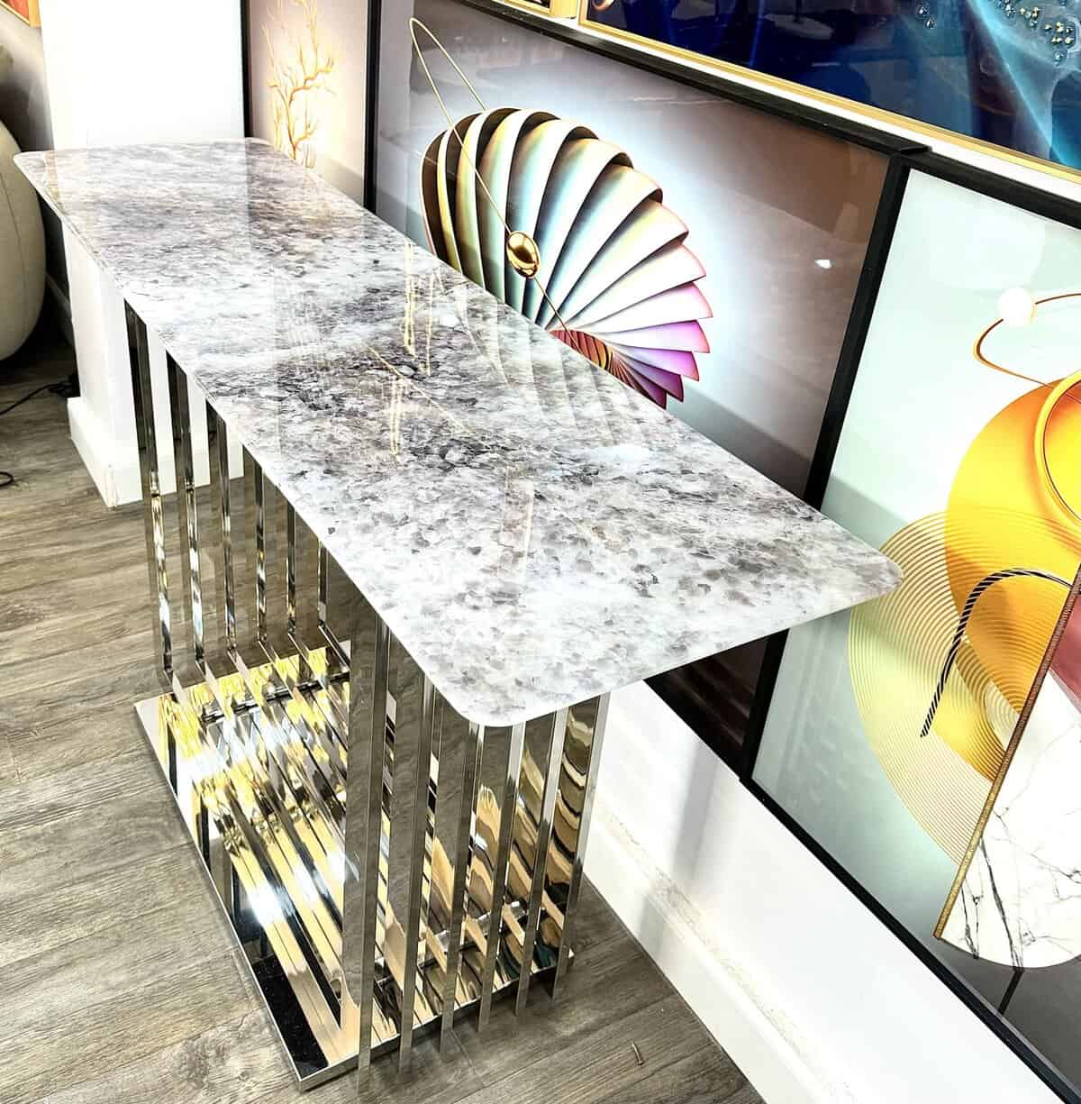 The table top is made up of 0.70-inch marble top, it’s texture is exquisite and beautiful, and it’s surface is glossy and smooth. The rectangular marble tops provide the vintage and elegant feel you are looking for in your home. easy to clean and maintain. simply wipe with a damp cloth to keep the console table looking like new. can be used as console table, sofa table, behind couch table, entry hallway table.