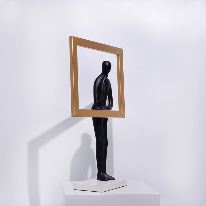 A commanding piece of modern artistry, the Gilded Reflection Large Sculpture represents wisdom, growth, and the power of perspective. Crafted from sleek black resin and encased within a bold golden metal frame, this striking figure stands tall on a solid marble base. Its abstract yet refined design makes it a perfect statement piece for contemporary interiors, executive spaces, or art-inspired collections.