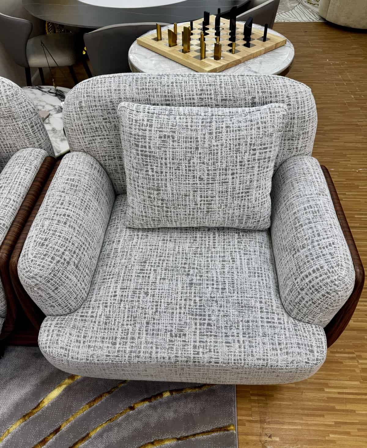 Made of premium wood and soft premium fabric, this lounge chair embodies elegance and comfort, featuring a refined structure with smooth edges and plush cushioning that adds a sense of luxury to any modern space. Its sturdy frame ensures durability while maintaining a cozy and inviting aesthetic, making it perfect for relaxation or accent seating in high-end interiors.