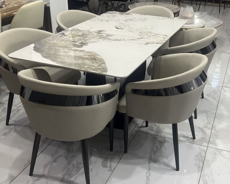 This luxury dining boasting of a high quality marble top is perfect when it comes to choice of a dining for you and your family. The contemporary design, sleak seating and the combination of quality finished chairs, are all the ingredients you need to create a stylish setting for an exceptional dining. The color contrast and stylish design create a rich visual enhancement.