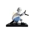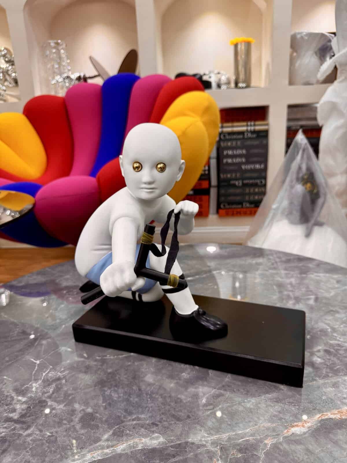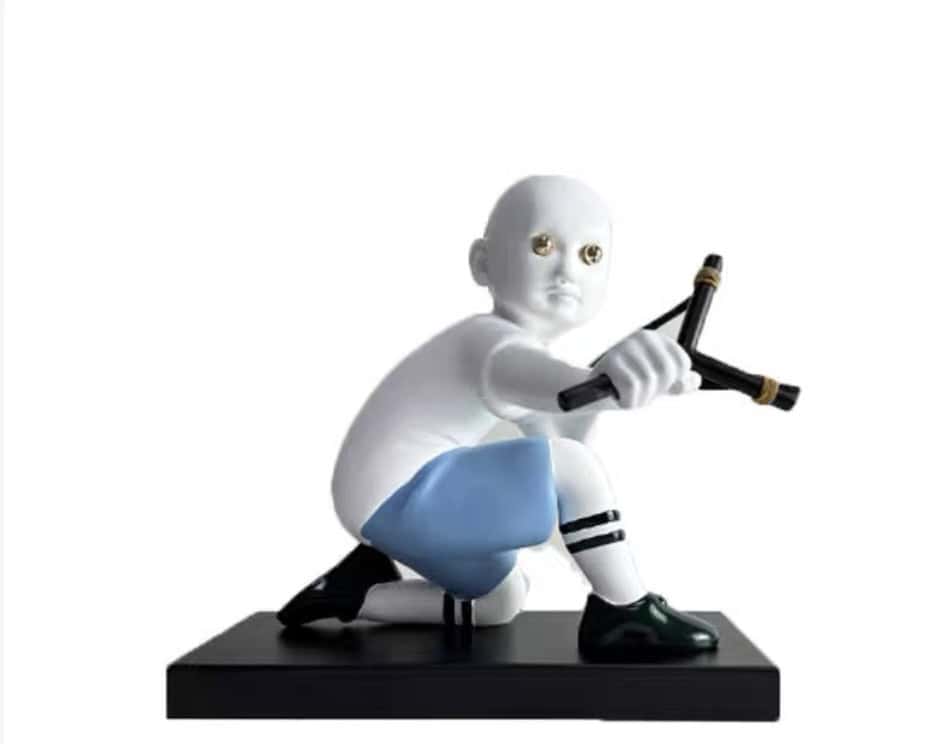 The artwork features a white figure with golden eyes, crouched on a black rectangular base, holding a slingshot.