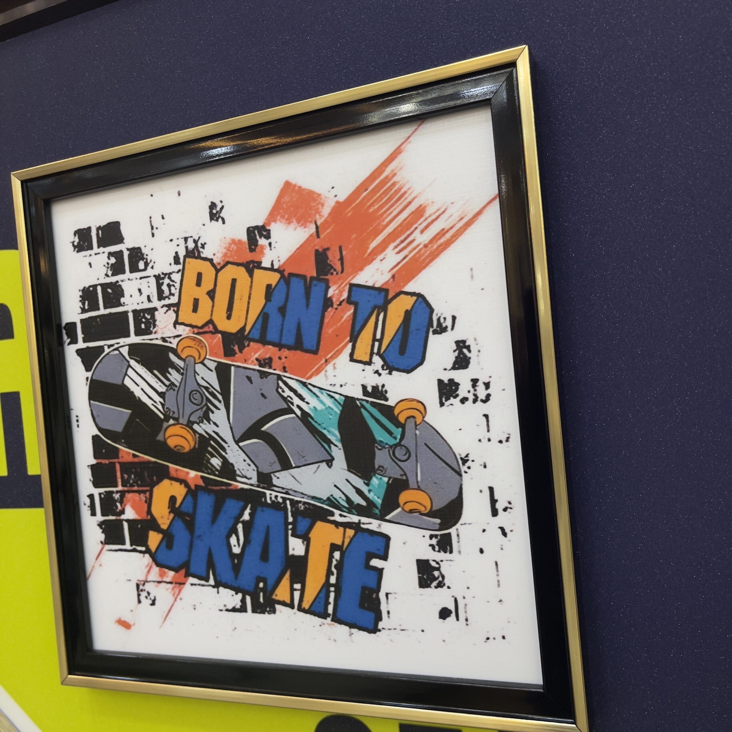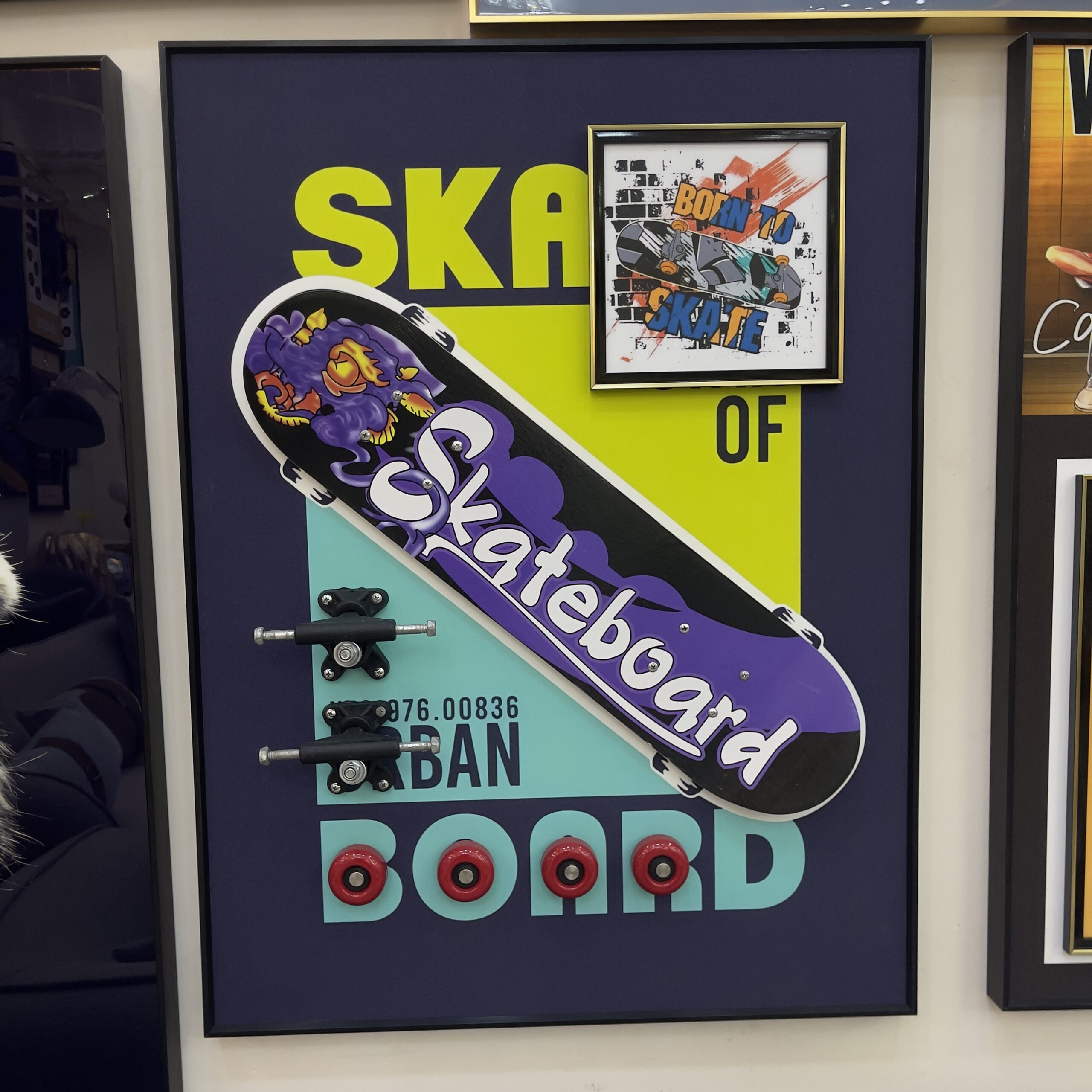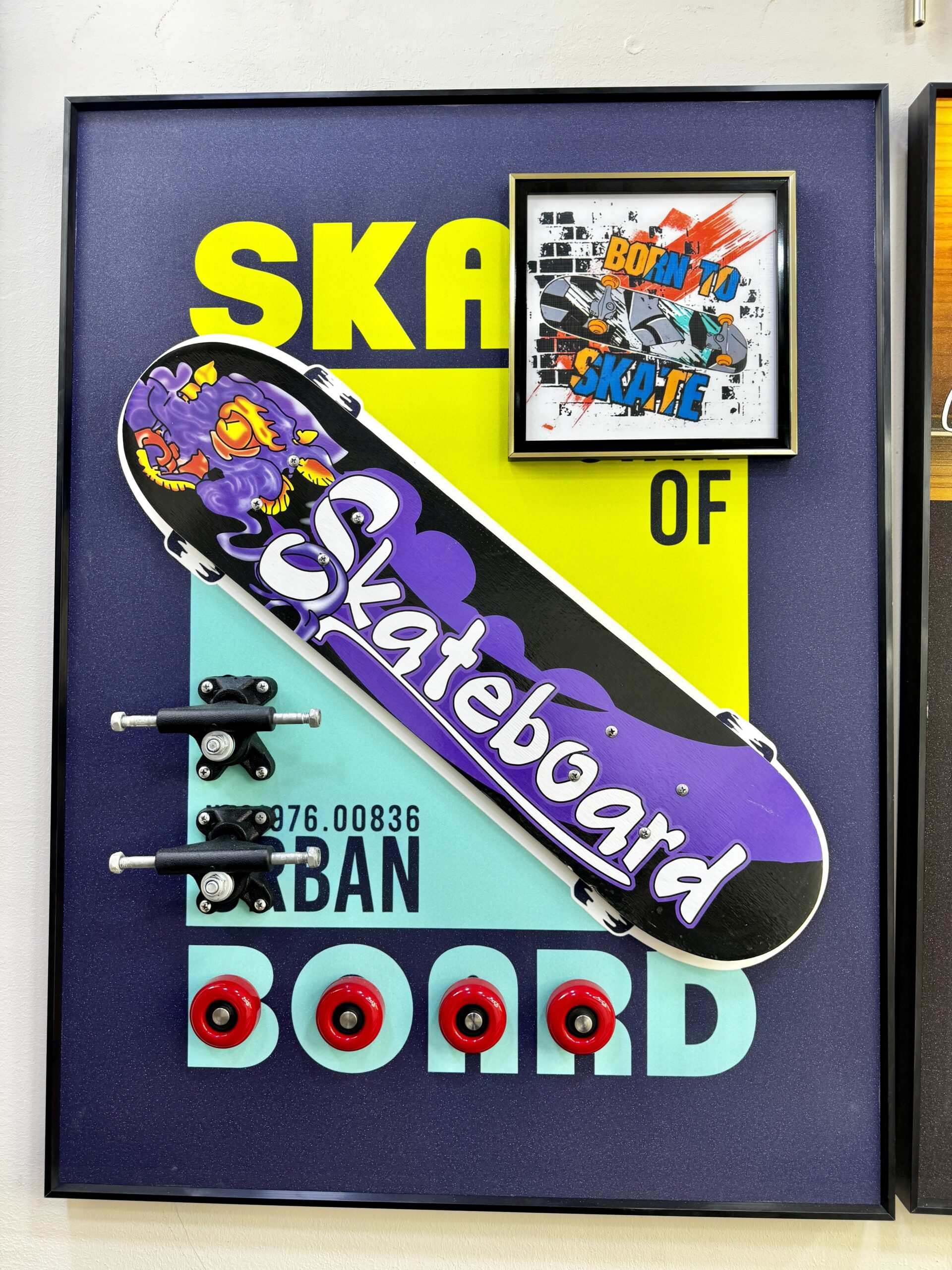 Bring a bold and artistic edge to your space with this Purple Themed Skateboard Wall Frame. Designed to stand out, this piece features a real skateboard seamlessly integrated into a stylish framed display, creating a unique fusion of street culture and modern decor. The vibrant purple theme adds depth and personality, making it a perfect centerpiece for creative spaces, lounges, or personal rooms. Crafted with a durable frame and protective glass, this wall art offers both visual impact and lasting quality.