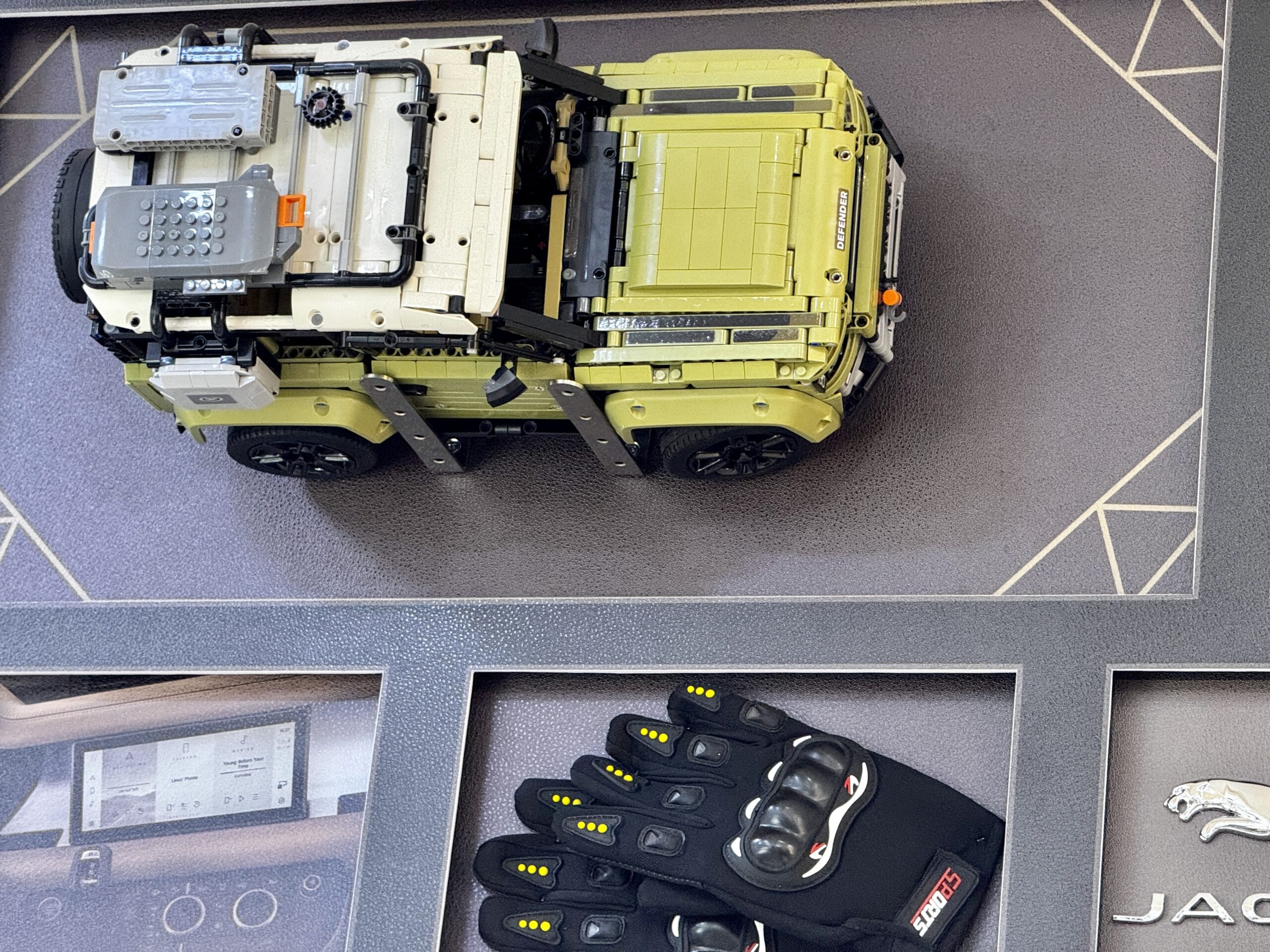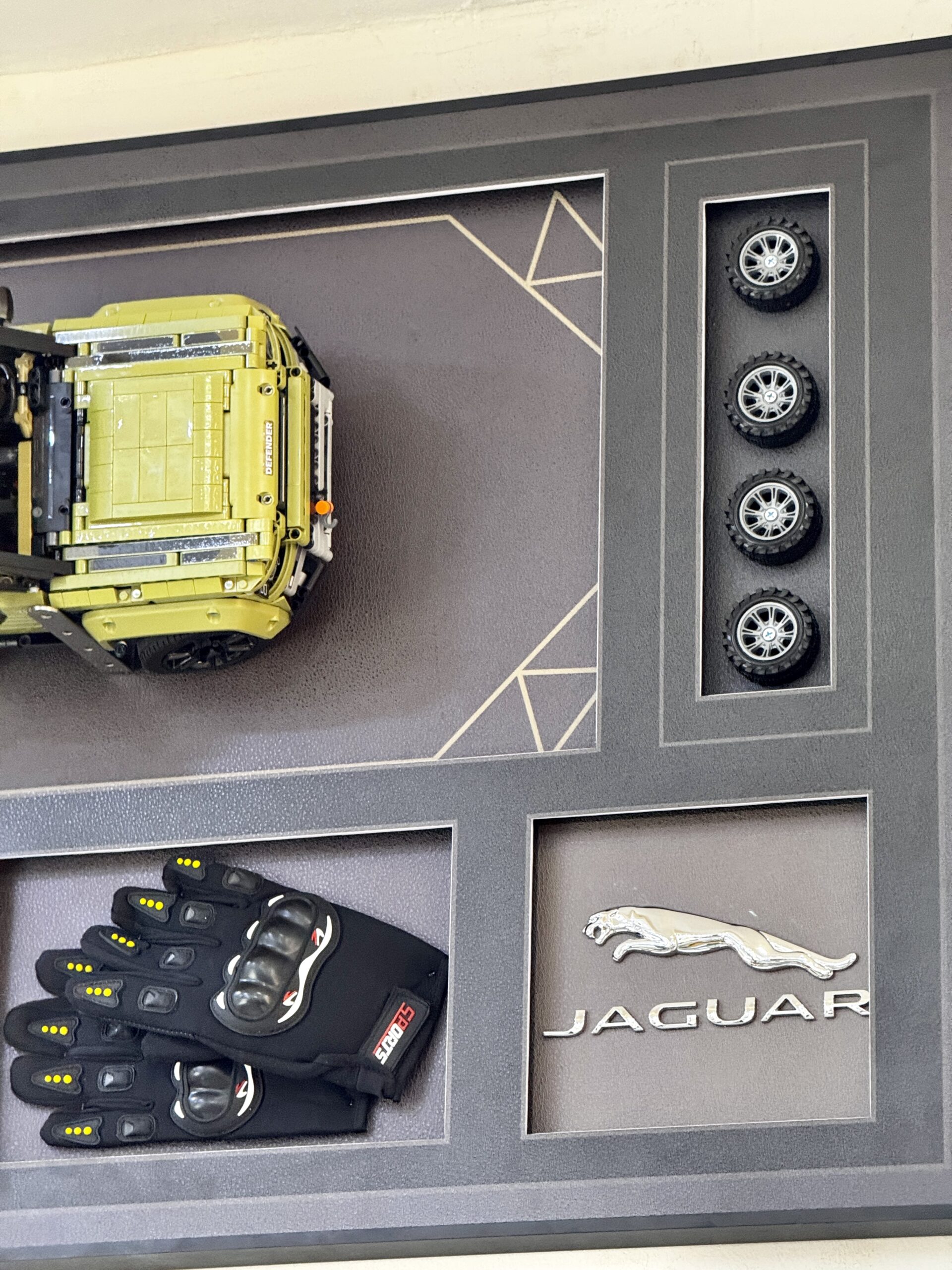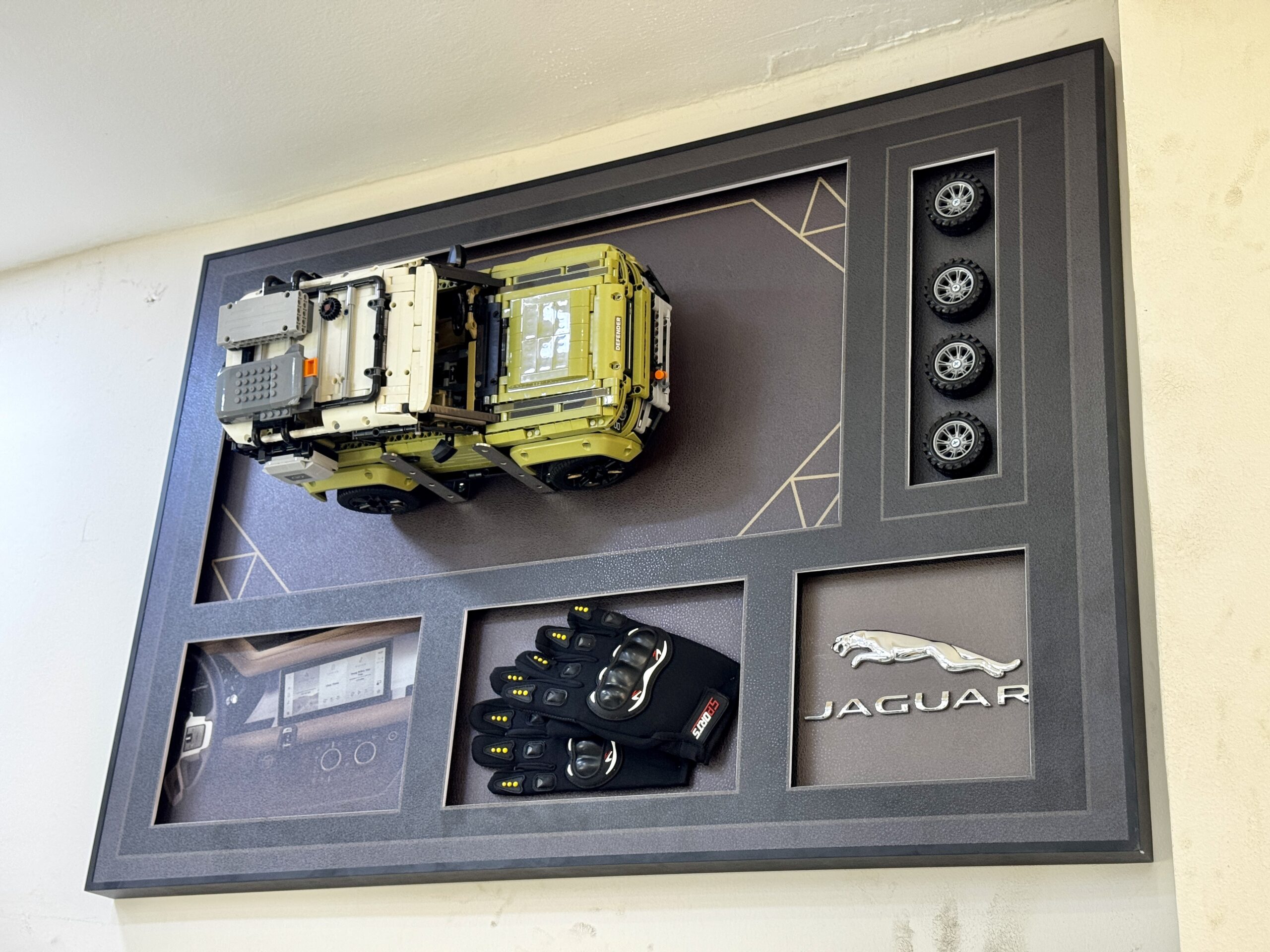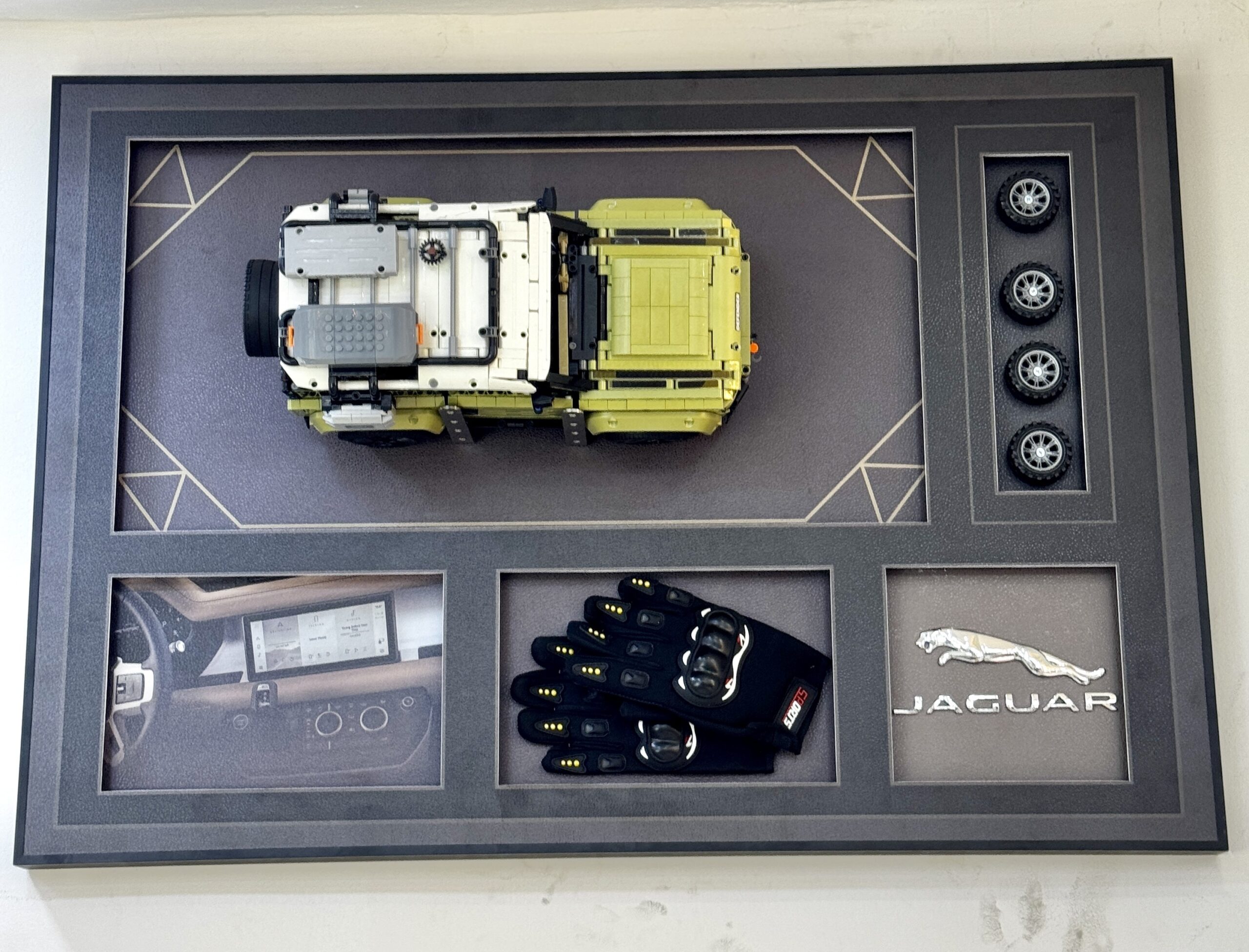 Elevate your space with this striking Jaguar Land Rover LEGO SUV Wall Frame, crafted for lovers of automotive design and unique decor. Featuring a meticulously detailed green SUV made from LEGO elements, this piece captures the rugged elegance of the iconic vehicle. The addition of real racing gloves enhances its authenticity, while the dark-toned background creates a bold contrast that makes the design stand out. Measuring 70 × 100 cm, this wall frame delivers a powerful 3D visual effect, making it a perfect statement piece for car enthusiasts, lounges, or contemporary interiors.
