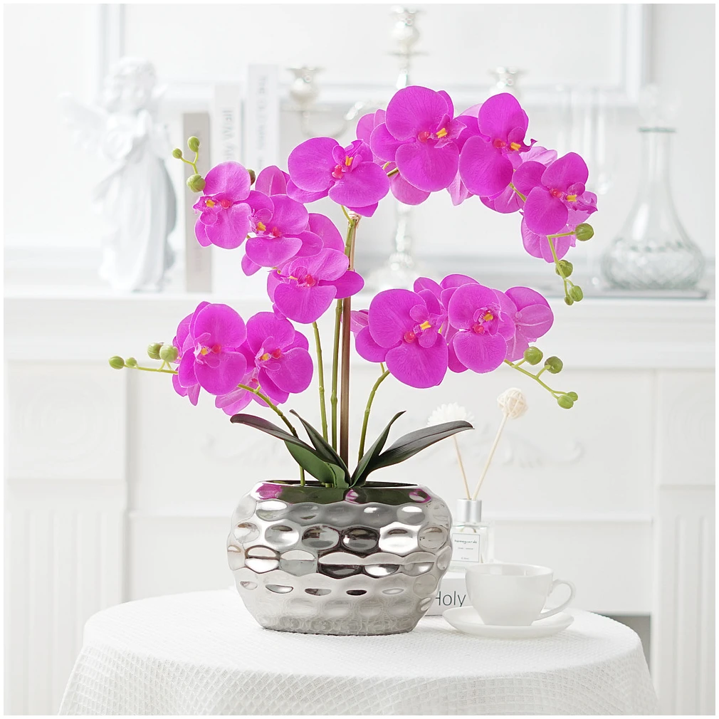 Housed in a sleek, silver-textured vase with a reflective, hammered finish, this arrangement embodies modern refinement. The metallic sheen of the vase adds a touch of opulence, making it an exquisite statement piece for any interior. Whether as a centerpiece or a decorative accent, this orchid arrangement brings a sense of serenity and luxury to any space.
