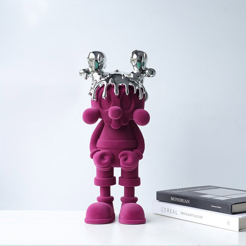 This striking KAWS-inspired decor piece features a bold design with molten silver detailing that appears to drip from the top of the ears down to the forehead, giving it an edgy, surreal feel. Crafted from high-quality resin with a flocked matte finish for a soft, velvet-like texture, the piece is accented with metallic plating that enhances the silver drip effect. The combination of soft flocking and high-shine silver plating creates a dramatic contrast, making it a standout collectible or centerpiece for any modern art space.
